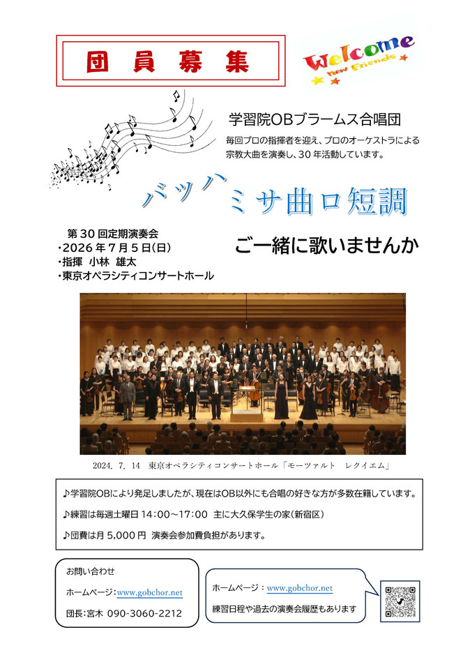 学生時代に学習院輔仁会音楽部混声合唱団に所属していたメンバーが中心になって1990年創設されましたが、今は広く門戸を開いています。合唱音楽を愛する人でしたらどなたでも大歓迎です。